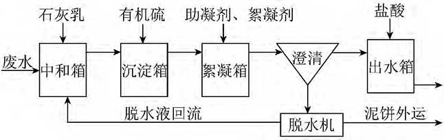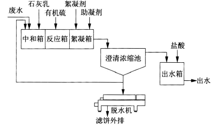 本處理系統(tǒng)包括:廢水池、清水池、混合反應(yīng)器、三聯(lián)箱、澄清器、壓濾機(jī)、各種加藥裝置等。